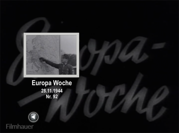 Wien: Trauerfeier am 23.11.1944 für den gefallenen Major Walter Nowotny; Zagreb (Kroatien): Allerheiligen 1944; Deutschland: Ausbildung von Jugendlichen in einer Adolf Hitler Schule; Prag (Reichsprotektorat Böhmen und Mähren): Schachturnier; Spanien: Weinlese; Deutschland: Herstellung von Pferdepreßfutter; Deutschland: Kosakengestüt; Deutschland: Bahnhofshelferinnen bei der Fertigung von Winterkleidung; Lorient (Frankreich): Deutsche Soldaten in dem eingeschlossenen Atlantikstützpunkt