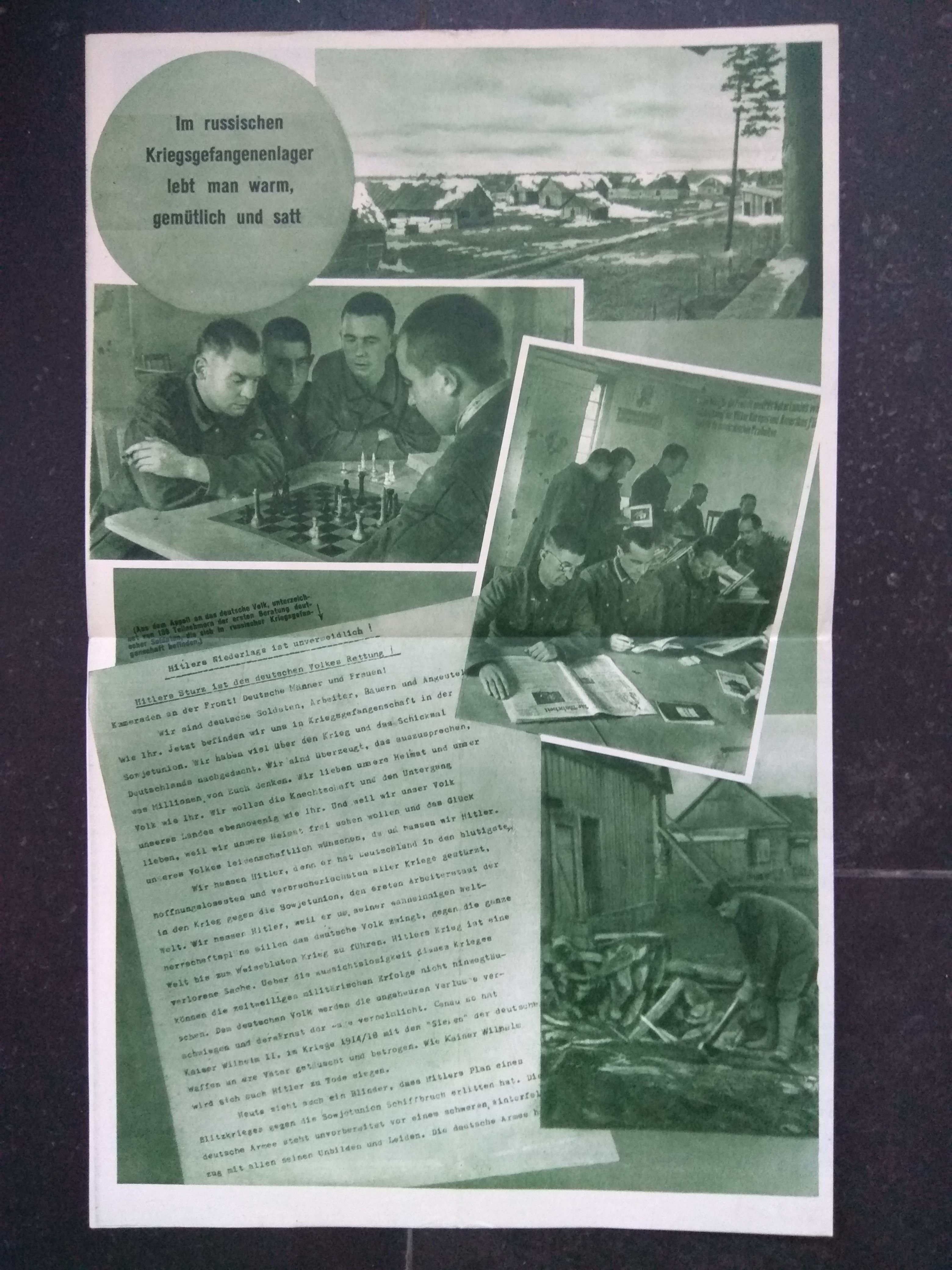 The journal appeared first in July 1941, the last number 97 is from April 1945. Contained numerous caricatures and photomontages, which were mainly designed by Aleksander Zhitomirsky (and strongly remind of Heartfield). It also emphasizes the inevitable decline of the German army and the exemplary treatment of German prisoners of war and the civilian population in the occupied territories by the Red Army.