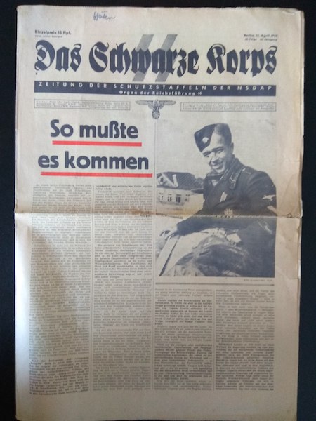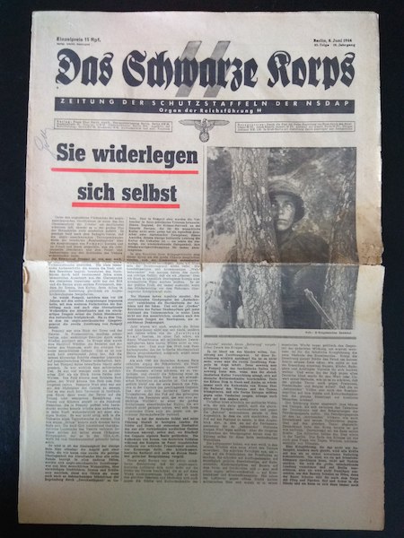 Das Schwarze Korps war die offizielle Zeitung des Schutzstaffel. Diese Zeitung wurde mittwochs veröffentlicht und kostenlos verteilt. Jedes SS-Mitglied wurde ermutigt, es zu lesen. Chefredakteur war SS-Führer Gunter d'Alquen; Herausgeber war Max Amann vom Franz-Eher-Verlag